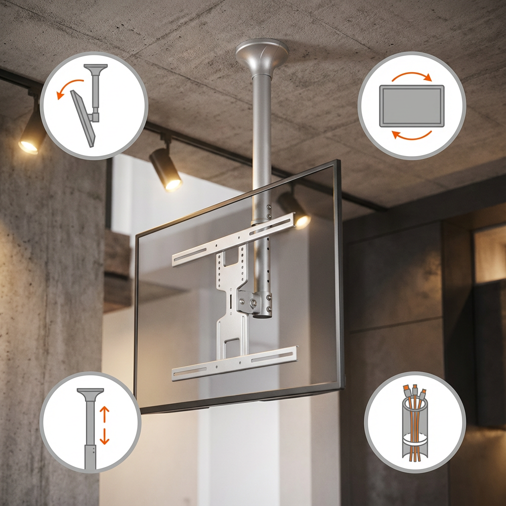 Ceiling mounts are ideal for spaces where walls cannot be used, such as shops or lobbies. They provide maximum visibility thanks to 360° rotation and adjustable tilt, while keeping the screen securely positioned at height.