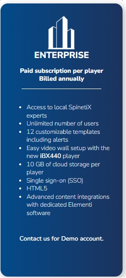 The Enterprise offer combines cloud flexibility with the unparalleled power of Elementi, the market-leading digital signage software. Benefit from over 250 data-driven widgets. Create complex projects in Elementi and deploy them effortlessly via the SpinetiX ARYA interface for global, controlled distribution.